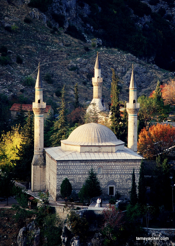 Akşam güneşi, Şeyh Edebalı Camii’ni altın sarısına boyuyor… Sonbahar yaprakları da bundan nasibini alıyor…